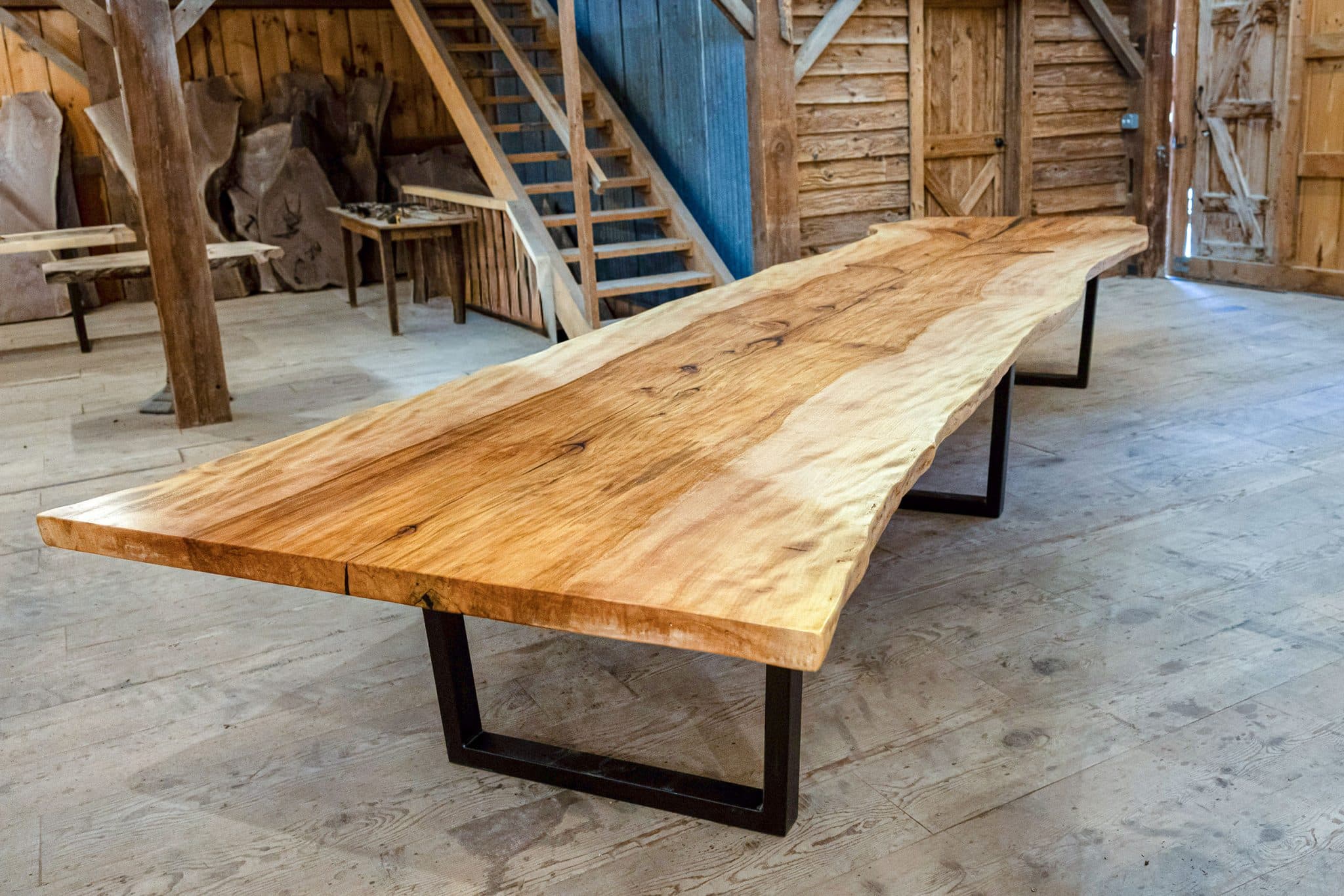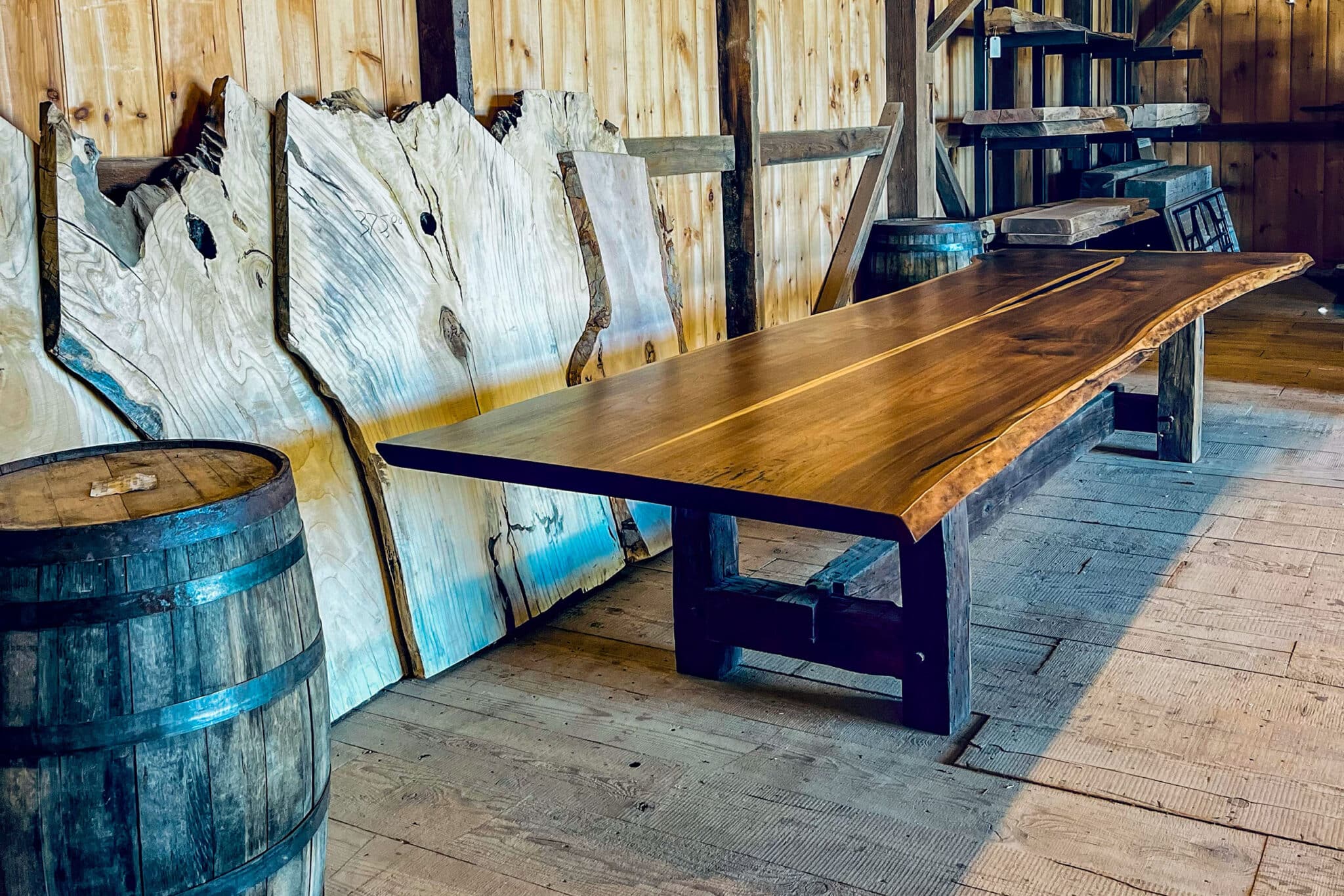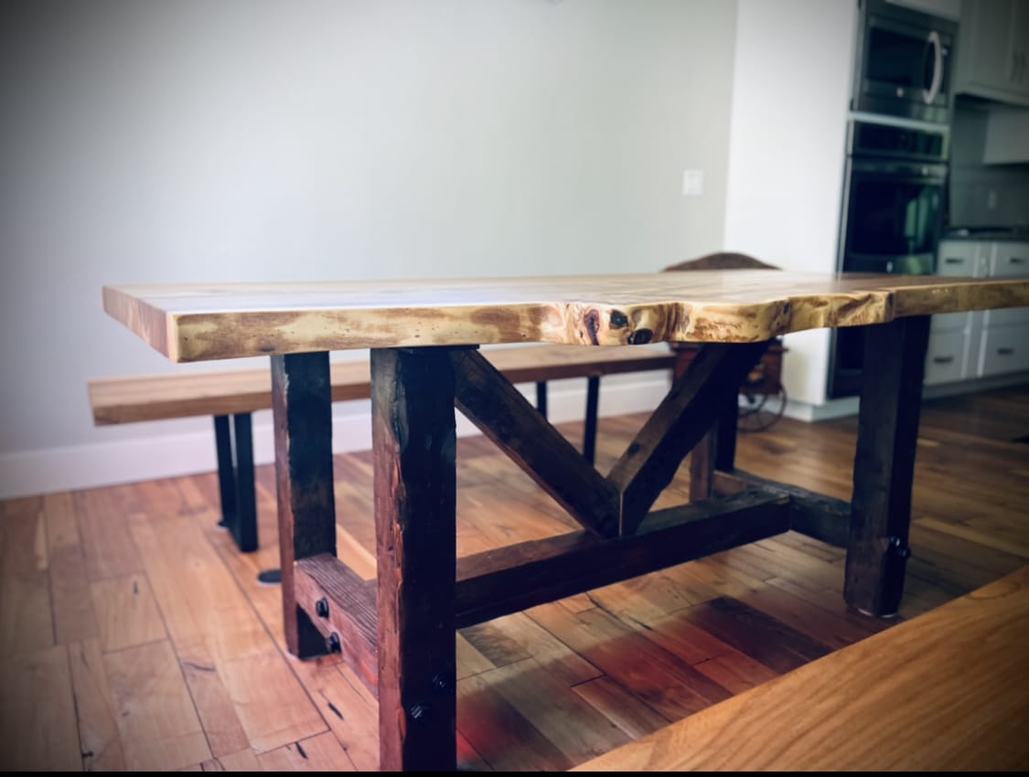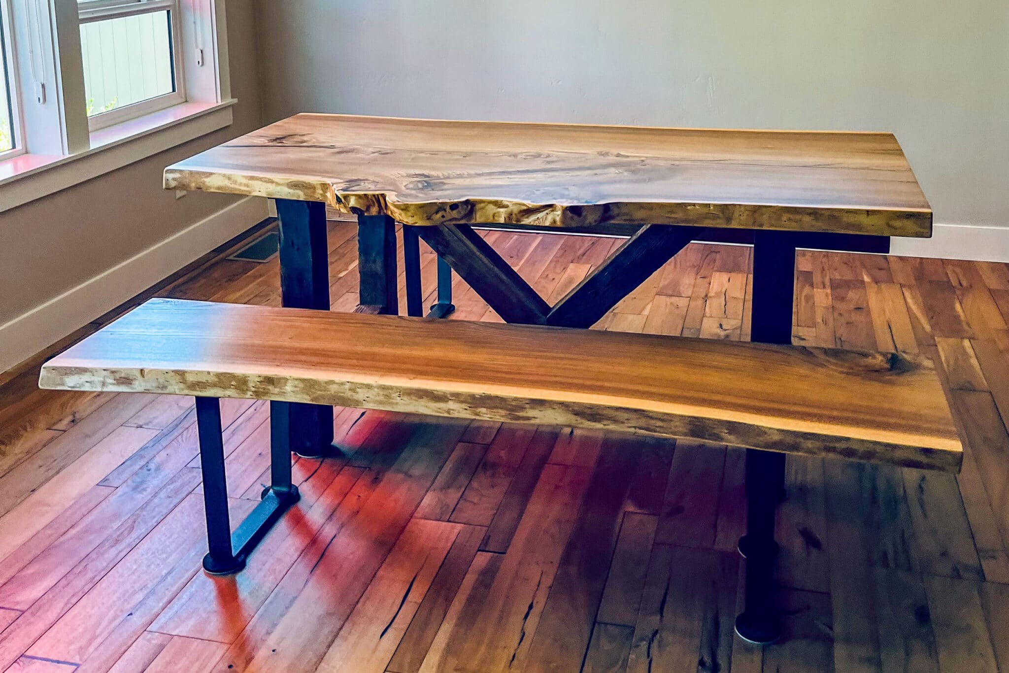 River Valley Woodworks has several table options. We can take local old wood, Douglas Fir butcher-block type slabs, or live edge hardwood slabs and make tables on a wooden or steel structure. We can also make benches to go with the tables. If you’re interested in building your own table with one of our slabs, read how here.